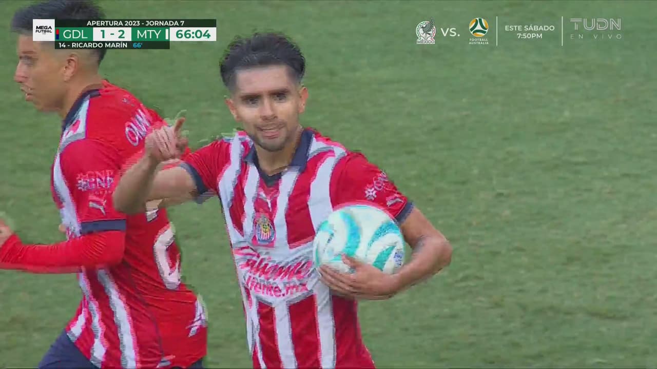 Chivas no bajó los brazos pese a la decisión en contra y siete minutos después, Calderón centró a segundo poste, donde Marín anticipó el movimiento, le ganó a Jesús Gallardo en el remate de cabeza y clavó, ahora sí, el primer gol de Chivas.