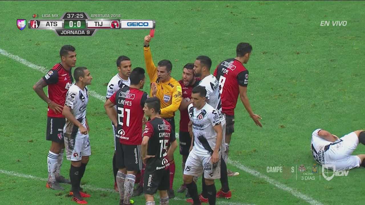 El juego comenzó con pocas opciones de gol, pero se condicionó desde el minuto 13 cuando ‘el Topo’ Valenzuela, después de despejar el balón, ‘planchó’ el tobillo de Garnica y el árbitro le mostró la roja al capitán de Xolos.
