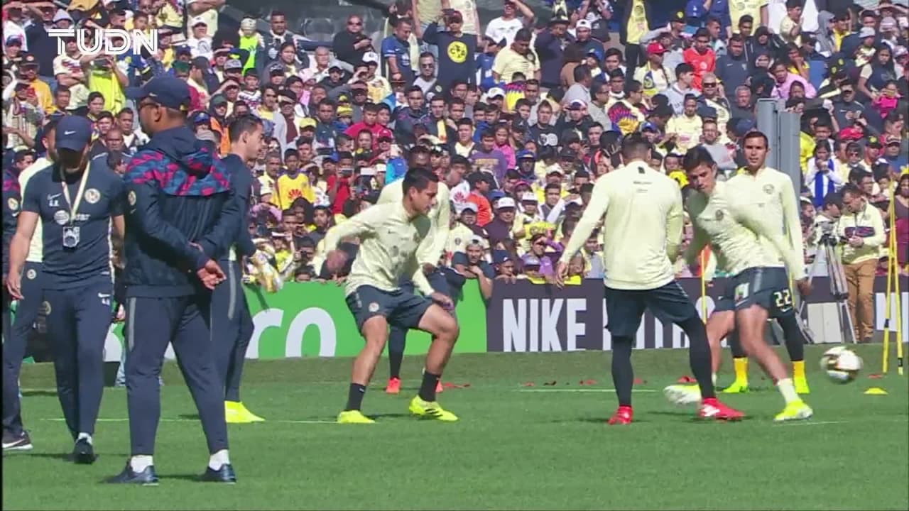 Nicolás Castillo, delantero del América, participó de forma ligera en el entrenamiento a puerta abierta que realizó el club este lunes en la cancha del Estadio Azteca previo a la Final del Apertura 2019.