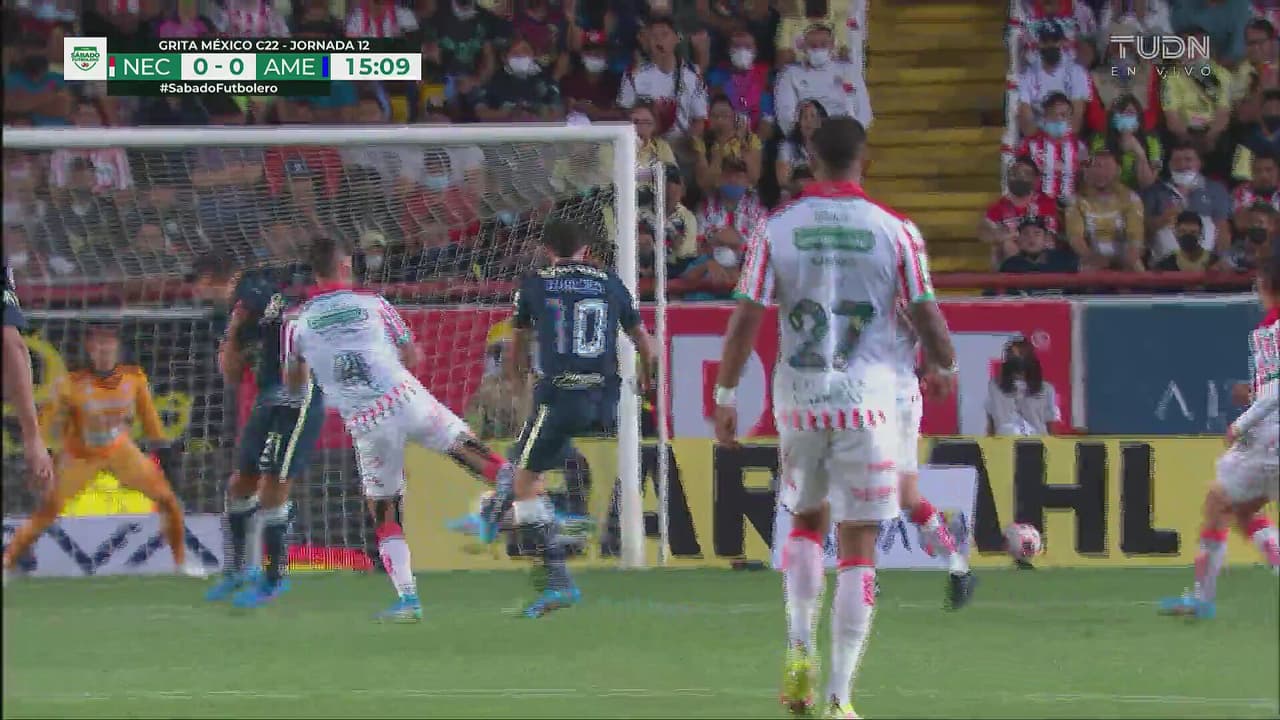 El atacante del América ve la oportunidad e intenta, pero termina en las manos del portero de Necaxa.