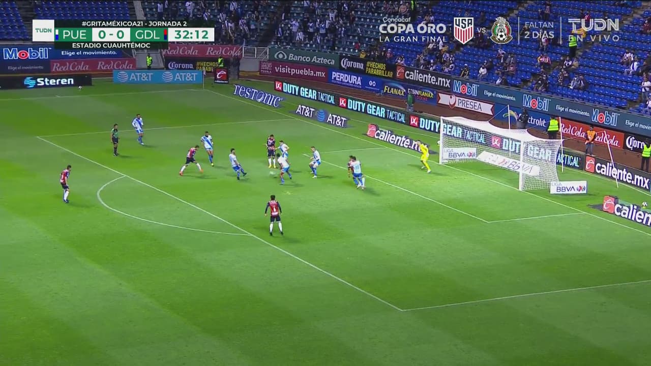Ángel prefirió pasar el esférico y la defensa de puebla contuvo el tiro de Carlos Cisneros al 32’.