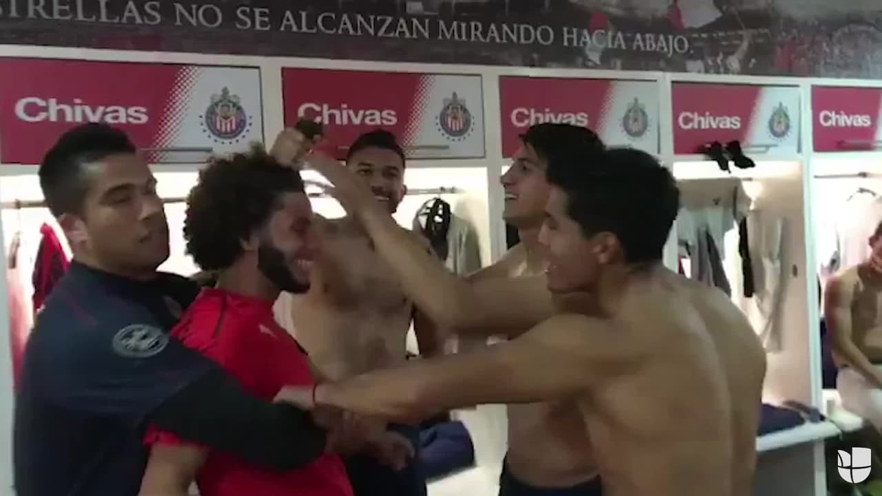 El delantero y el defensor y capitán de Chivas le realizaron un corte de pelo al joven jugador de 18 años de edad en pleno vestidor del Rebaño.