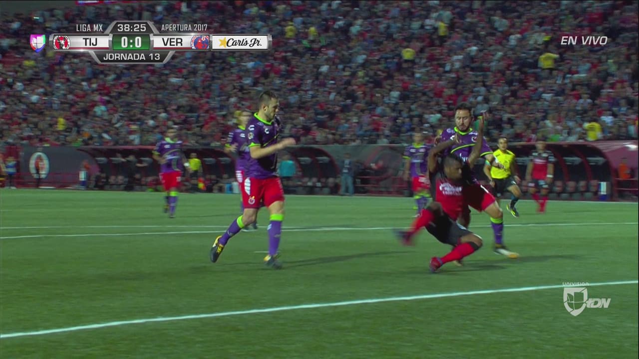 Son los mejores minutos de Tijuana, que buscando al atacante ecuatoriano se acerca con peligro al arco de Veracruz.