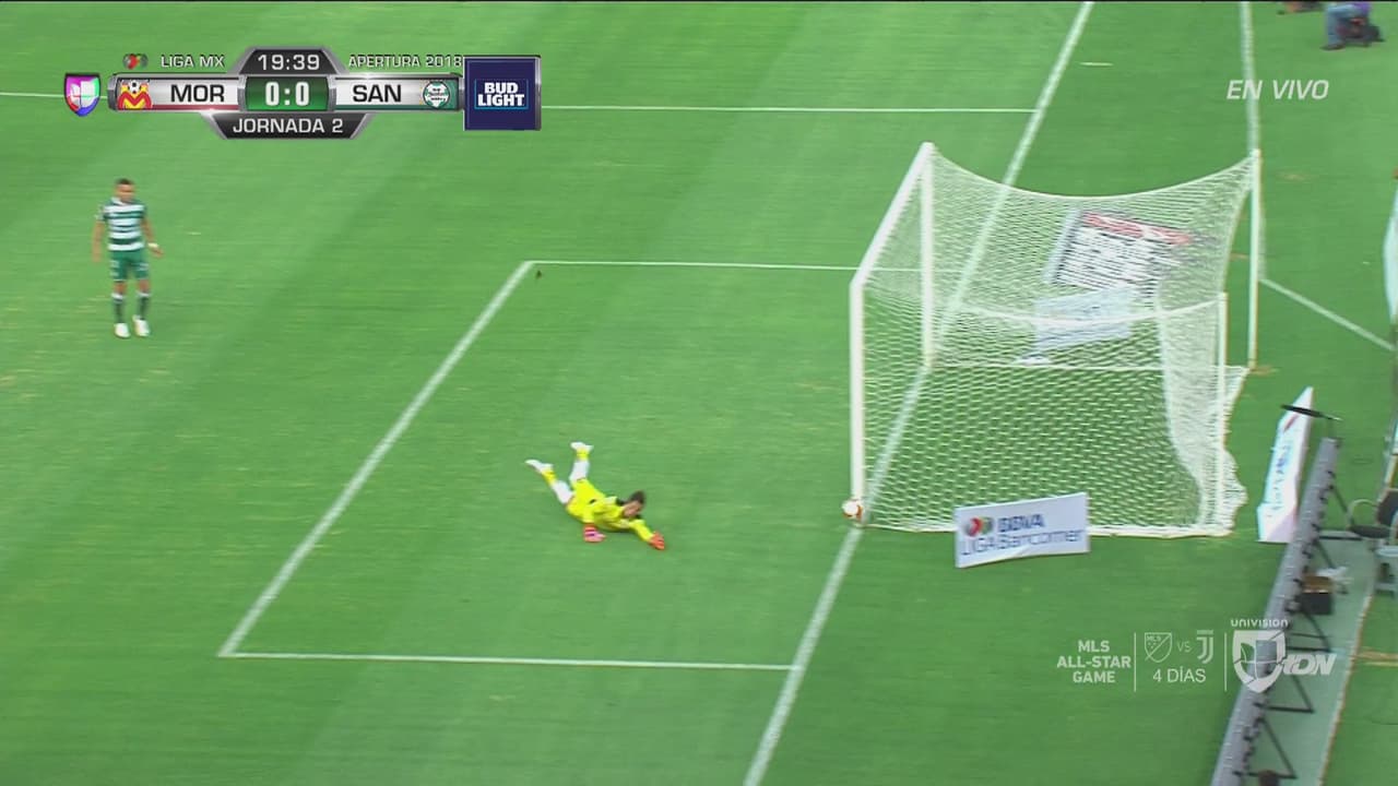 Carlos Orrantía dispara desde fuera del área un zurdazo que se estrella en el poste derecho del arco defendido por Carlos Sosa de Morelia.