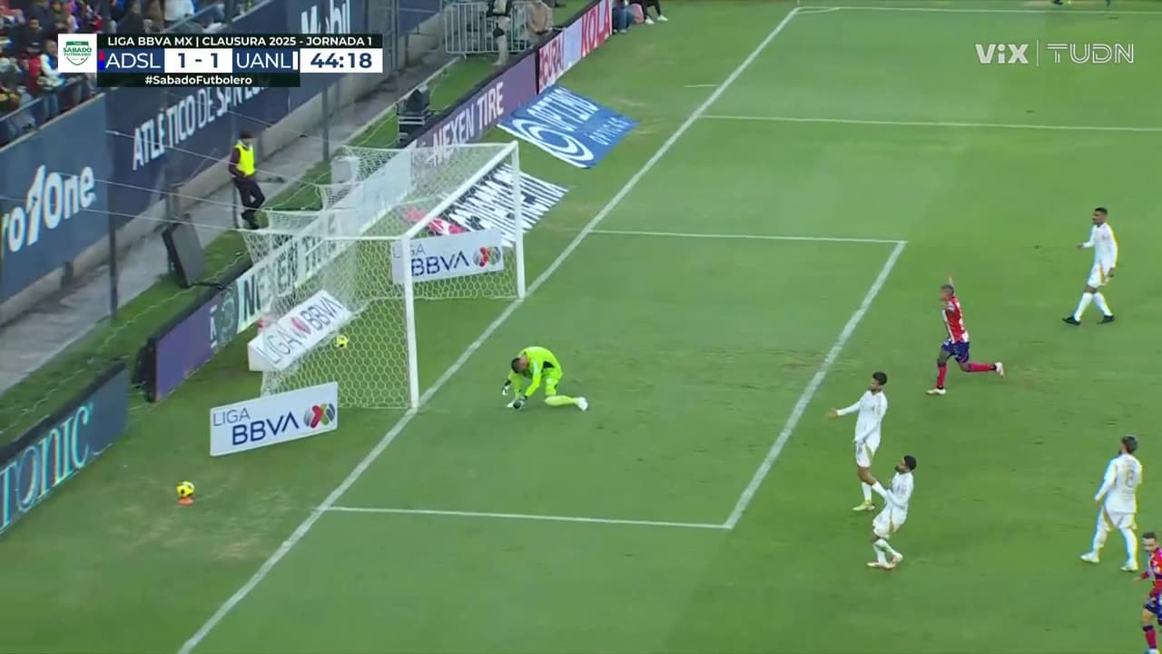 Nahuel Guzmán no puede detener el disparo del francés y San Luis empata el partido 1-1.