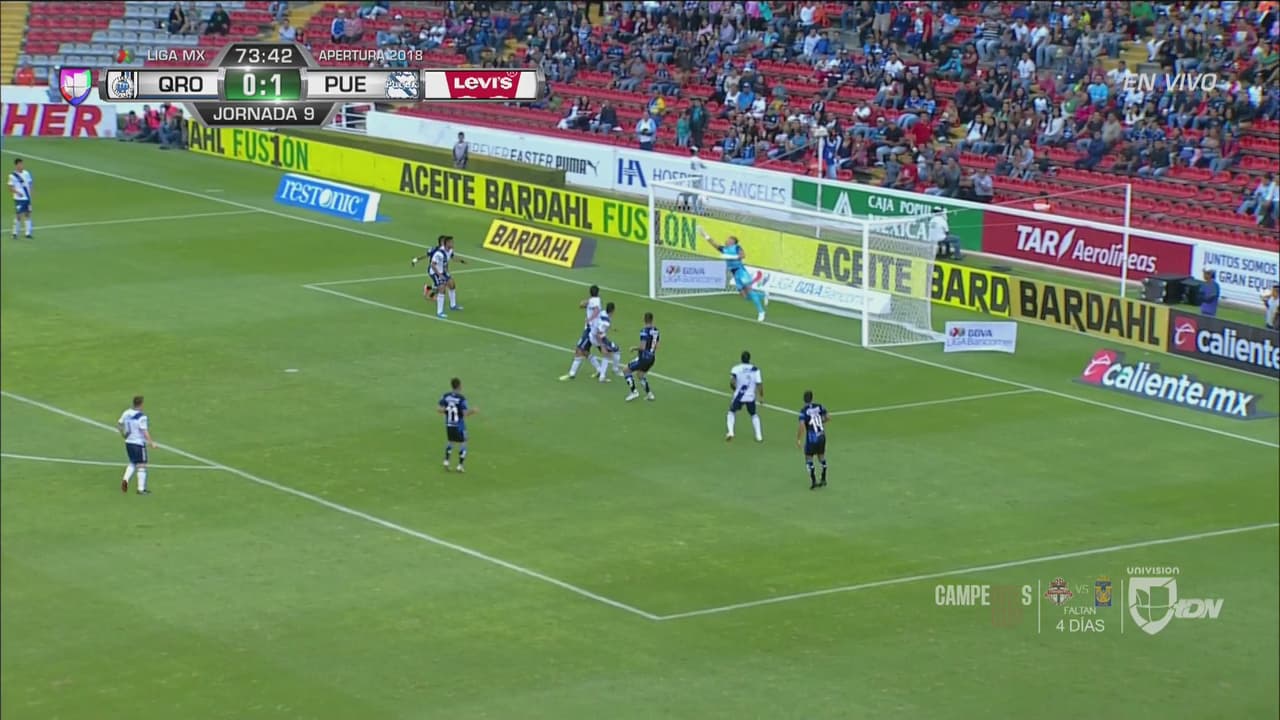 El delantero de Querétaro ganó en el área y cabeceó pero mejor estuvo la respuesta del portero Nikolás Vikonis en el arco de La Franja.