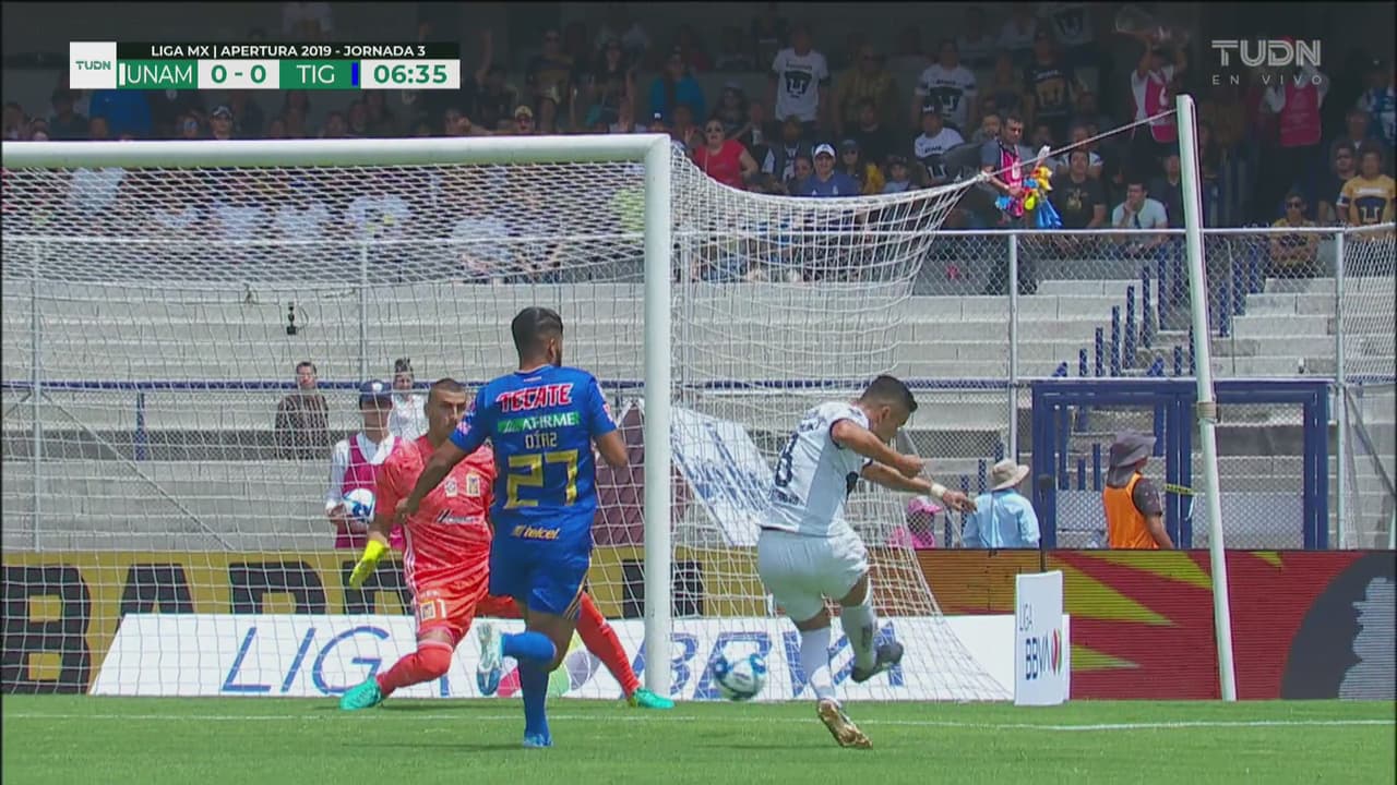 El mediocampista de Pumas recibió al espacio libre y ante la salida del portero de Tigres cruzó mucho el balón.