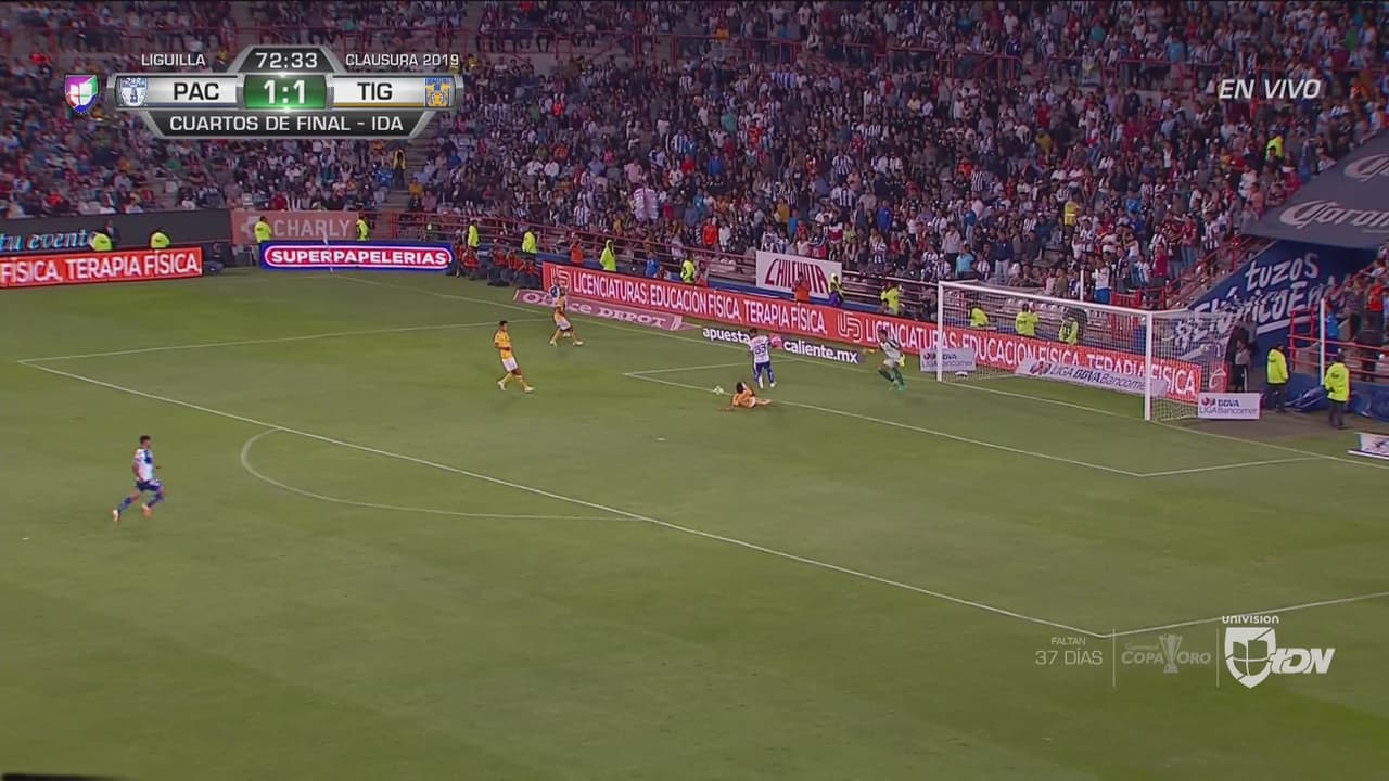 Desborde por izquierda de Ángelo Sagal que tira un centro buscando a Ismael Sosa cortado por la defensa de Tigres, al parecer con el pecho, pese a los señalamientos del respetable.
