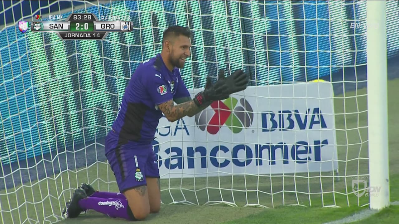Vaya atajada del portero de Santos Laguna tapando un remate que ya se cantaba como gol tras remates de Puch y Britos.