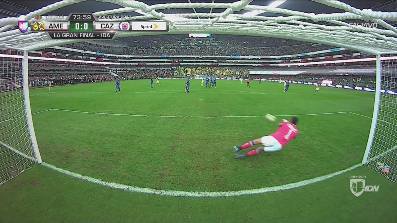 El defensor del América remató a ras de piso, pero encontró la buena respuesta del portero de Cruz Azul, quien se estiró sobre su brazo derecho y atajó el balón.