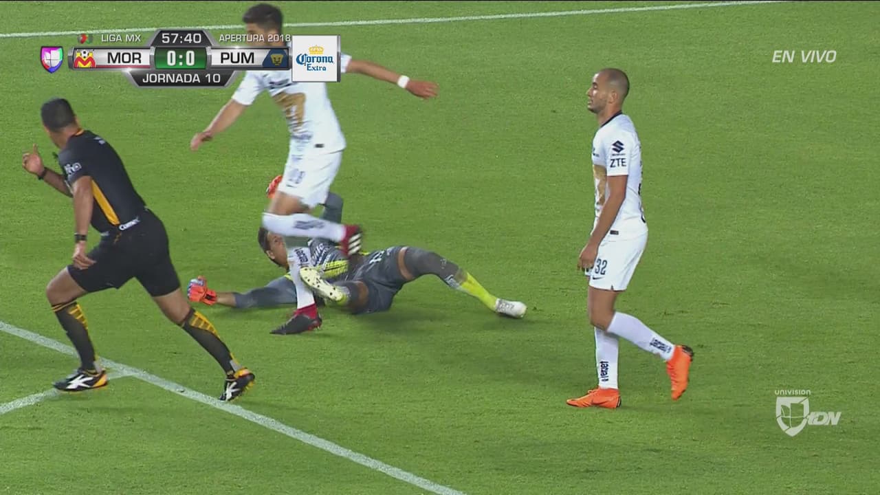 Con el silbante de frente, el guardameta de Morelia le mete fuerte la pierna al jugador de Pumas e inicia un contragolpe que por poco termina en gol.