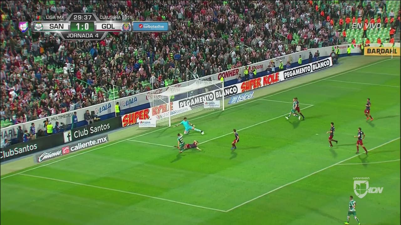 El portero de Chivas evitó el segundo gol de Santos, gracias a que el portero alcanzó a meter el pie izquierdo para rechazar el disparo cruzado de Javier Correa.