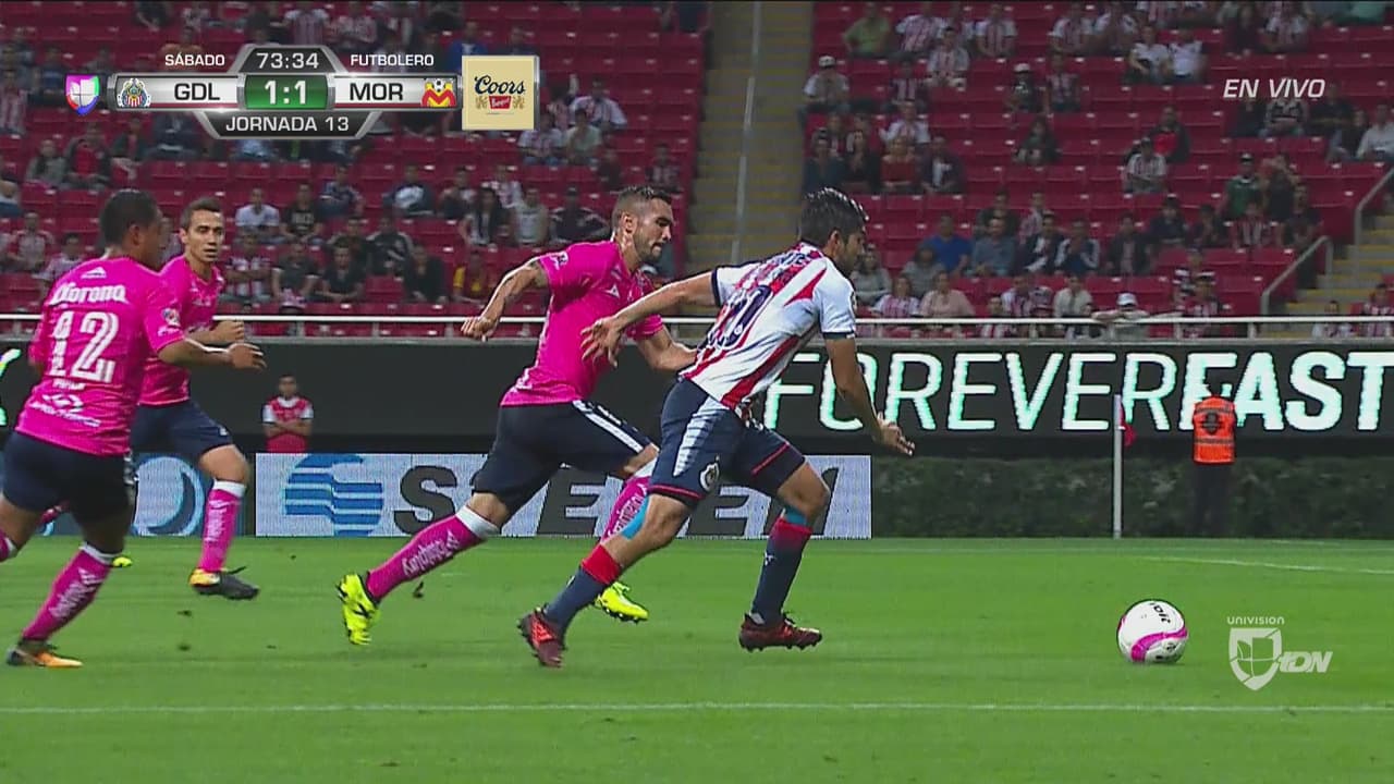 El volante del Guadalajara se metió al área y sacó un zapatazo de derecha que envió el balón directo al larguero de la portería de Sosa.