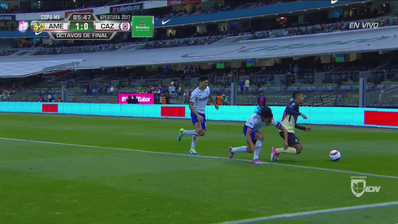 El mediocampista del América pisaba el área de Cruz Azul, cuando Jerry Flores lo derribó sobre la línea. El árbitro no decretó el penalti.