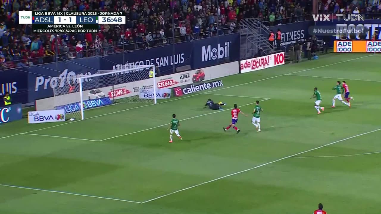 Bonatini con un taconazo deja solo al francés pero el portero esmeralda reacciona de gran manera para evitar el gol de San Luis.
