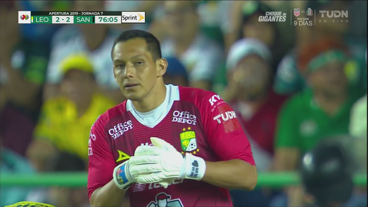 El uruguayo del Santos disparó a bocajarro frente al arquero del León, quien hizo una gran desviada al 76’.