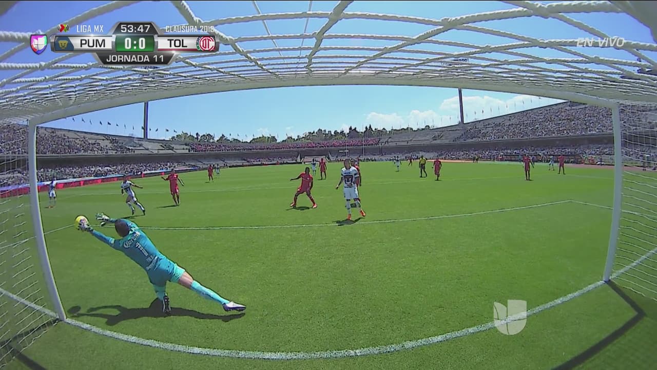 El delantero de Pumas hizo un gran remate, pero no contaba con la buena cobertura del arquero de Toluca.