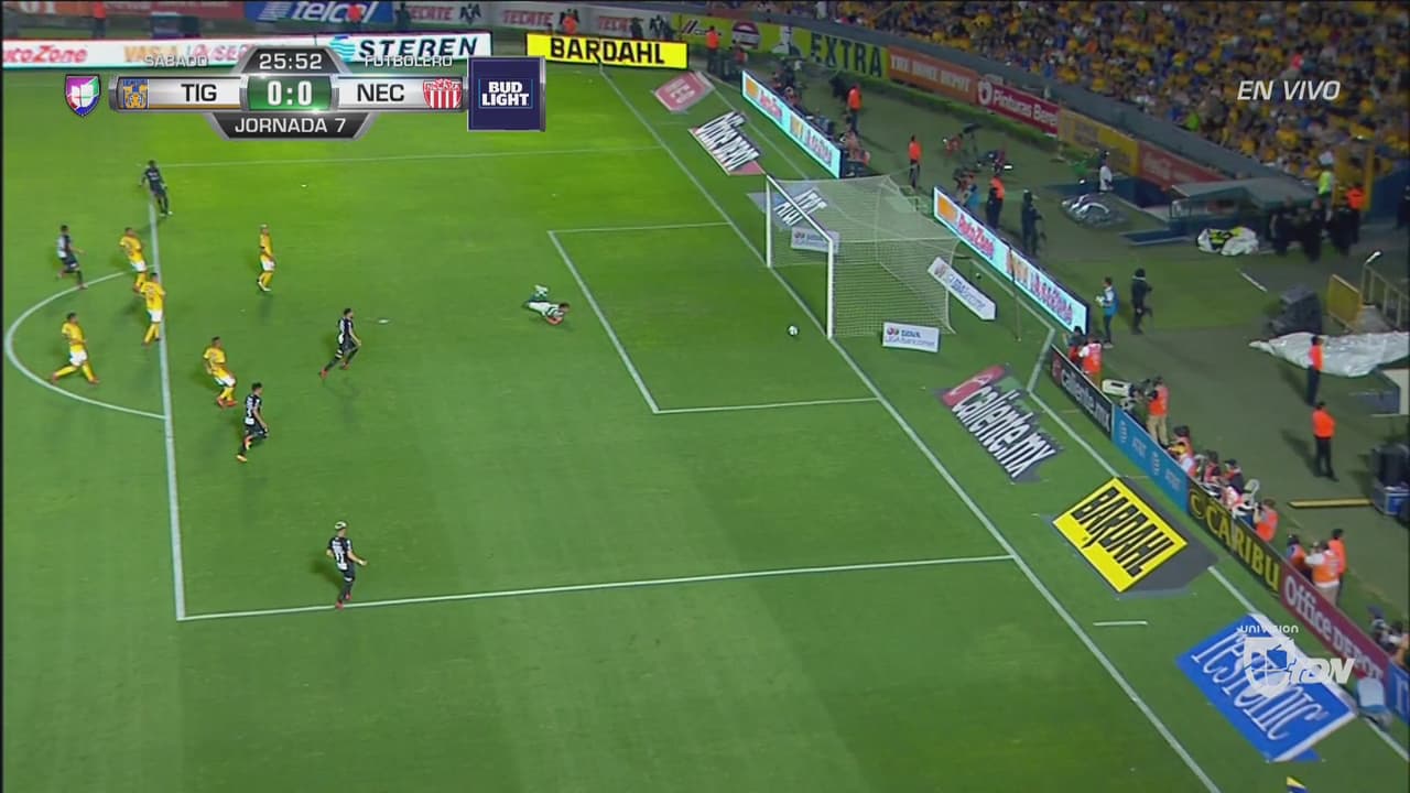 Ángel Sepulveda dispara con potencia y el esférico es reventado en el segundo poste de Nahuel Guzmán.