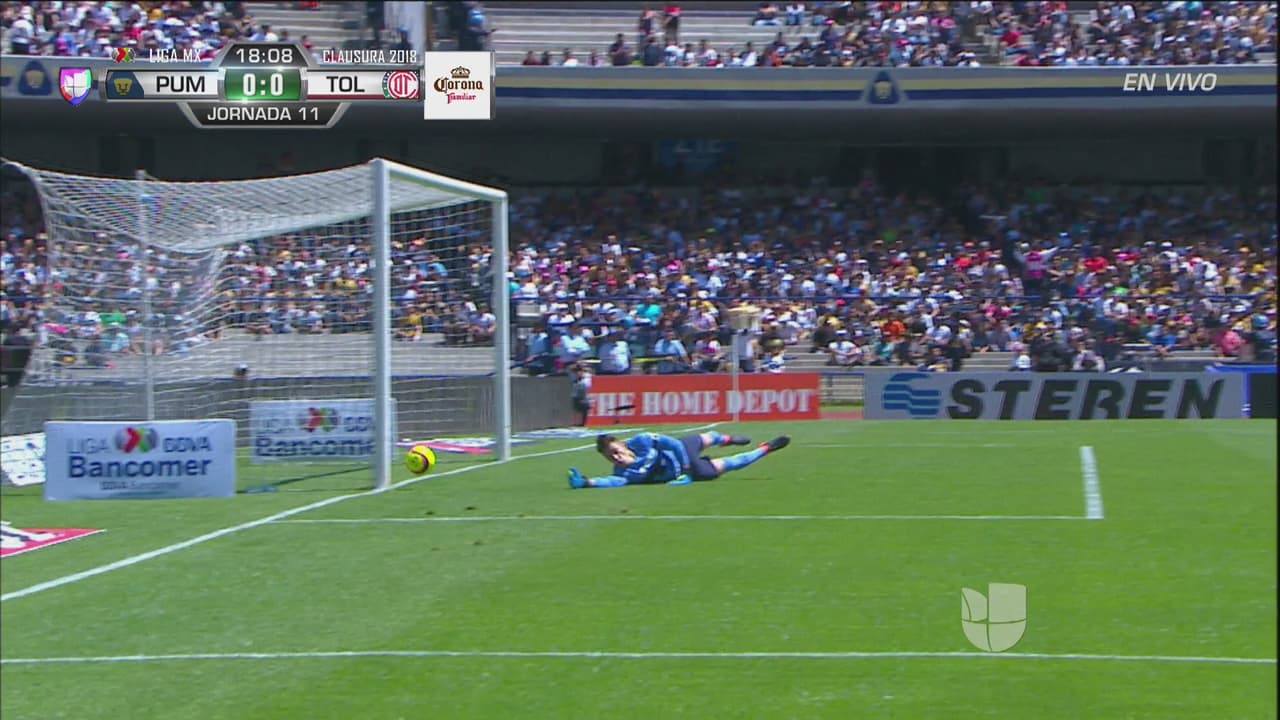 López se animó a pegarle de lejos y la puso en el poste del arco de Pumas, los rojos acariciaron el gol.