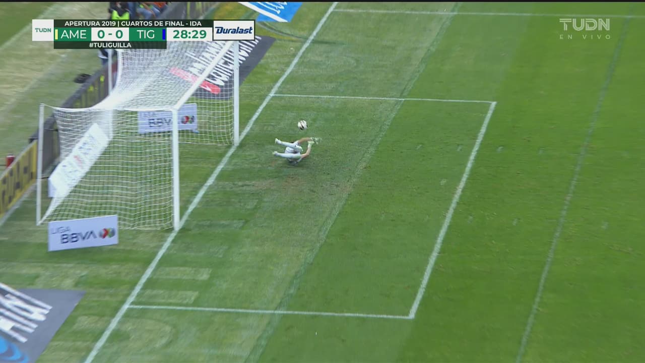 Tiro desde los linderos del área de Sebastián que el portero de los Tigres desvió al minuto 28.