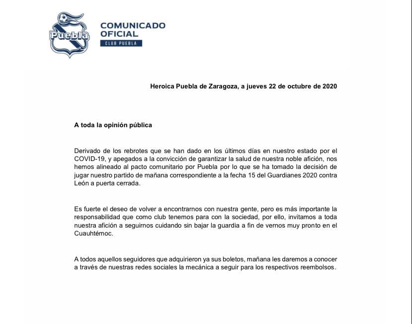 El motivo por el cual se decidió no dar acceso limitado a la afición se debe al rebrote de casos de coronavirus en el Estado de Puebla y así garantizar la salud de sus seguidores.