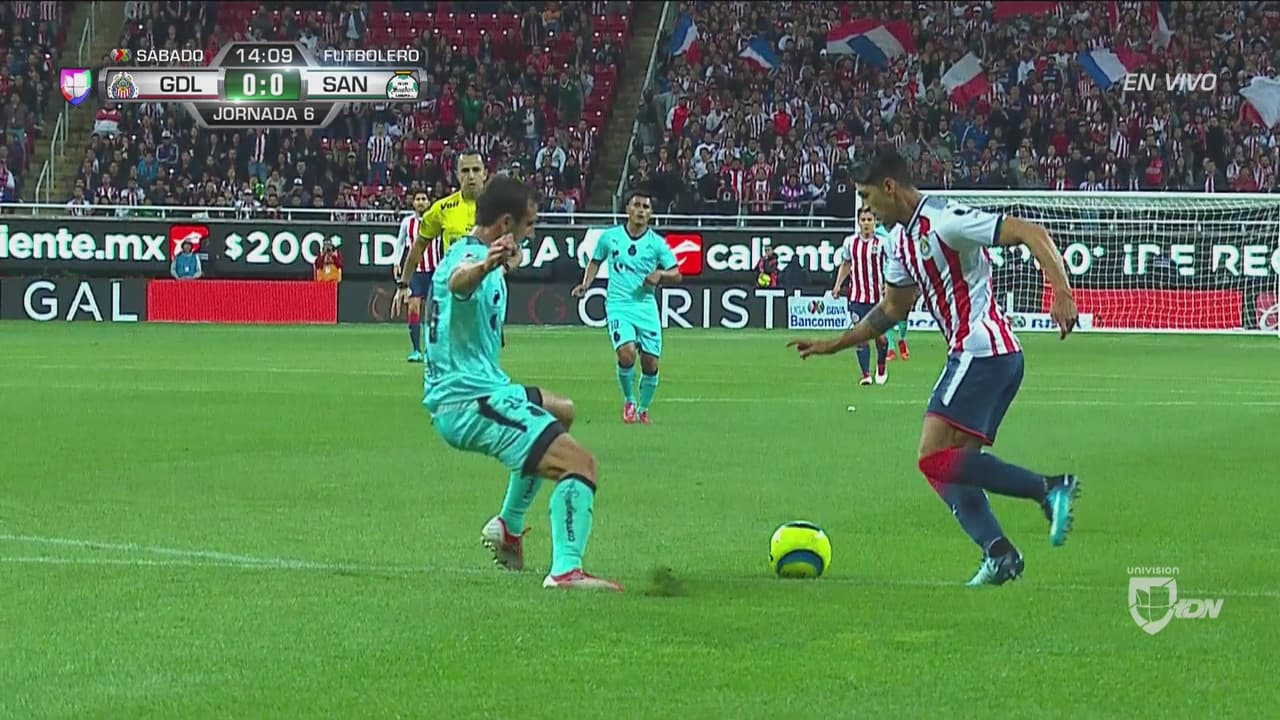 El delantero de Chivas tomó la pelota en tres cuartos y cuando parecía tener todo para irse mano a mano con el portero, la defensa se rehízo.