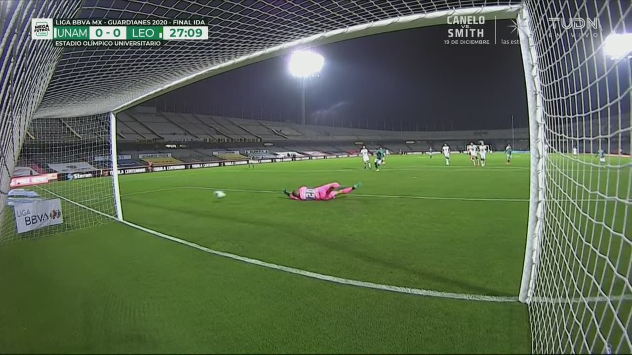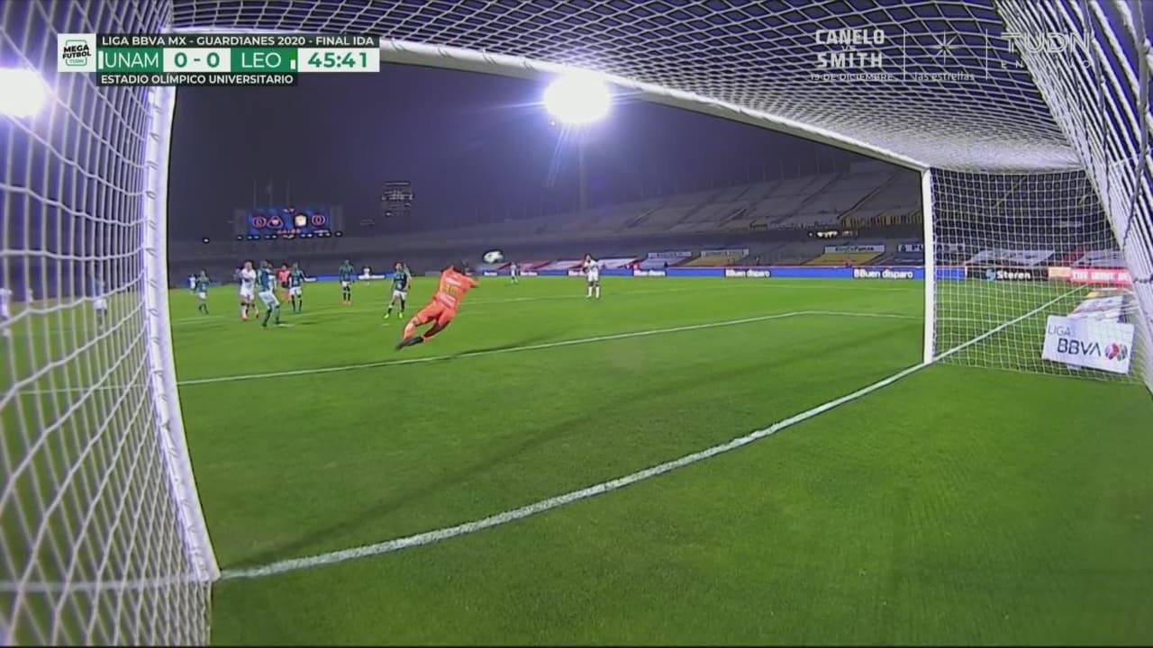 Los universitarios se conectan para atacar a León, Iturbe dispara con potencia, pero Cota se lanza para impedir que se abra el marcador.