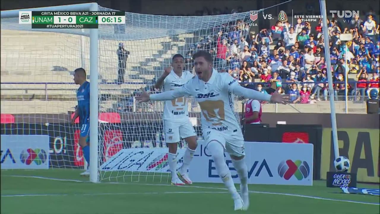Arturo Ortiz llegó por detrás para cabecear a bocajarro y abrir el marcador para Pumas.
