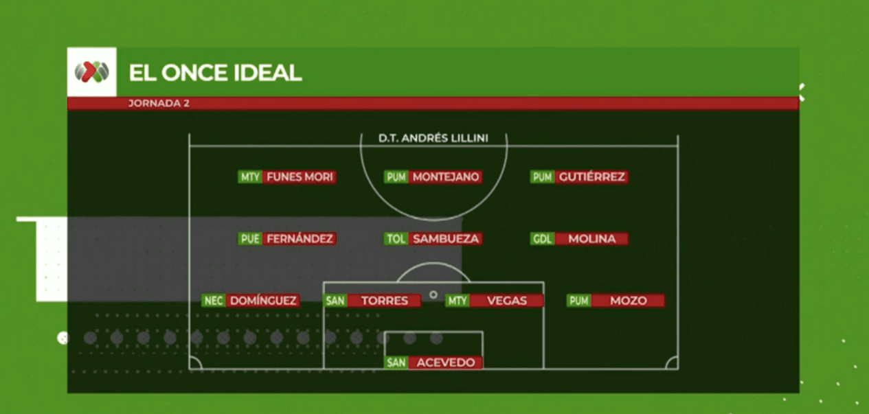 Además el desempeño de Alan Mozo fue muy bueno junto al de Carlos Gutiérrez por la banda, lo que les valió estar entre los mejores. Rayados metió a dos jugadores, Vegas que se plantó en la defensa y Rogelio Funes Mori que está On Fire en el arranque del torneo.
