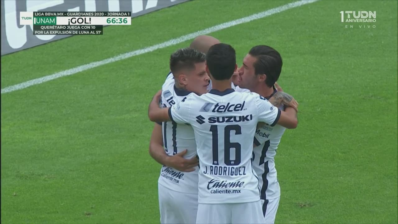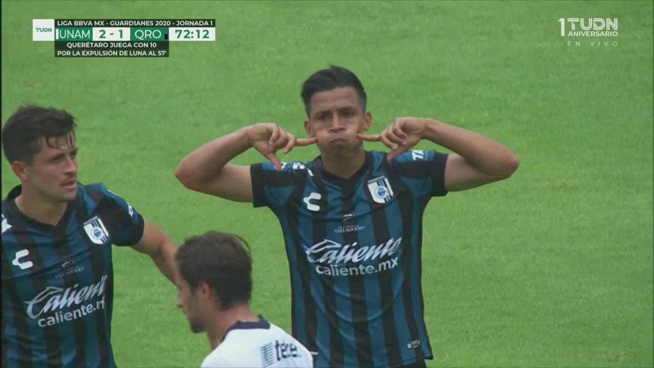 Pumas logró el primer triunfo en el Guard1anes 2020 BBVA MX al vencer 3-2 a Gallos Blancos con doblete de Dinneno, que alcanzó a Gignac en la tabla de goleadores de la liga. Un duelo accidentado, con dos tantos en propia puerta y mismo número de expulsados.