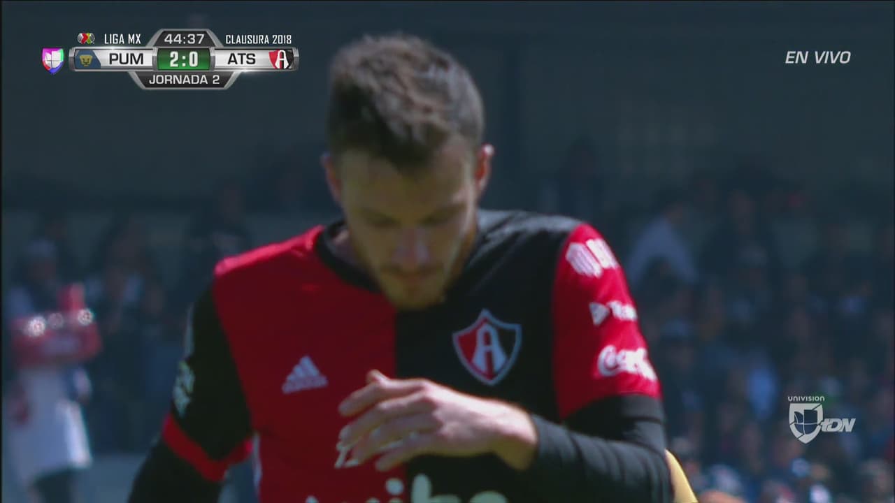 Atlas volvería a fallar en defensa y con ello llegaría el segundo gol de los Pumas, un balón mal controlado de Barreiro sería robado por Castillo, quien habilitó dentro del área a Matías Alustiza para que empujara la bola al fondo de las redes.