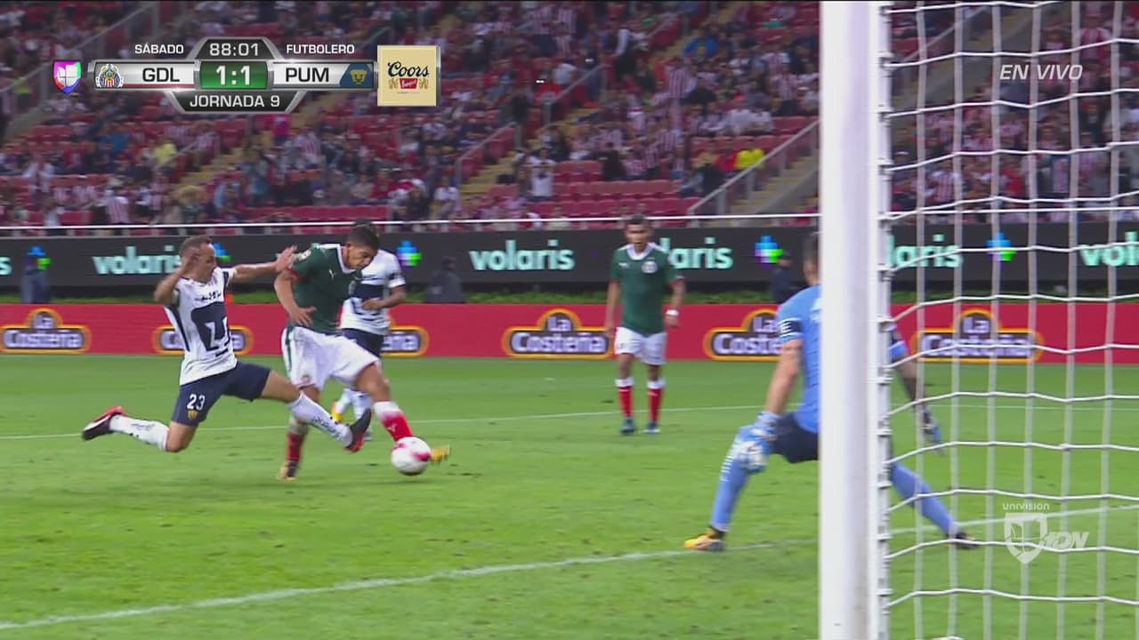 Cuando Pumas estaba más agobiado llegó el empate. Una serie de rebotes de Chivas acabó en los pies del canterano José de Jesús Godínez quien metió un soberbio derechazo que se incrustó en el ángulo de Alfredo Saldívar. Justo 1-1.