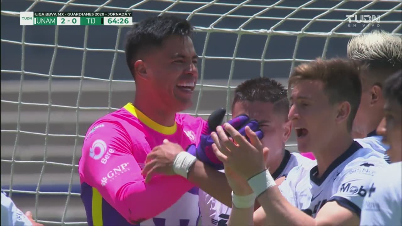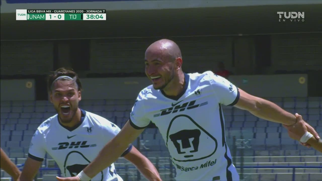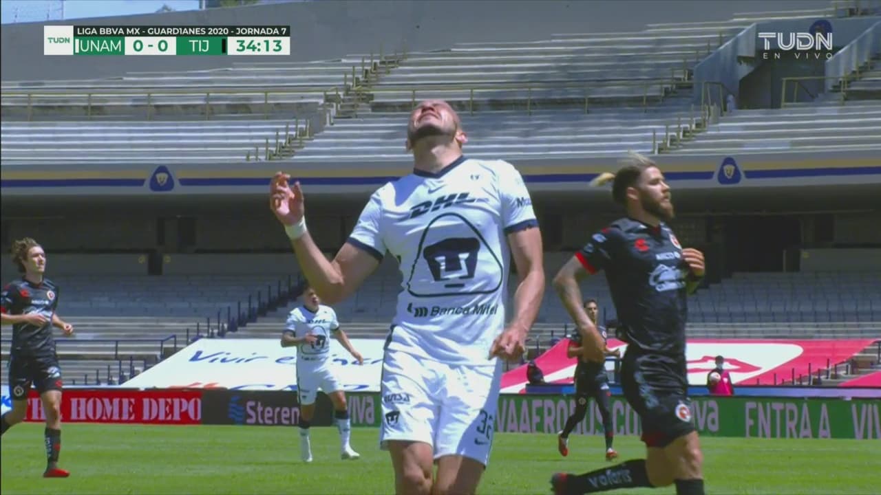 El duelo comenzó con el dominio a ultranaza de Pumas, que empezó a generar las ocasiones con su arsenal ofensivo. La dupla González-Dinenno volvió al ataque y combinaron perfecto para cimbrar la meta de Tijuana.
