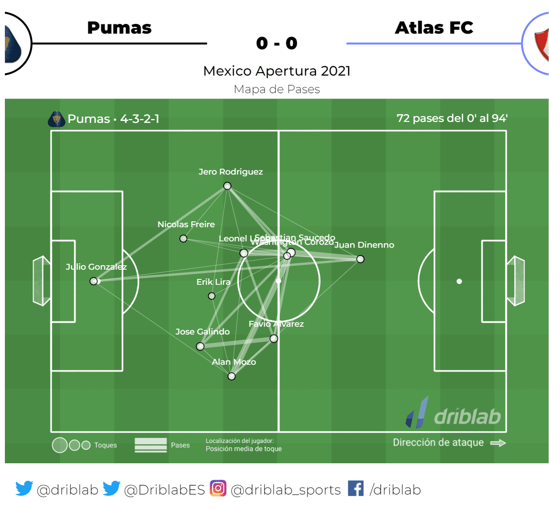 Pumas empató sin goles con Atlas y llegó a 369 minutos sin romper la red, los universitarios no anotan desde la Jornada 14 del torneo pasado cuando Juan Pablo Vigón marcó el tanto del triunfo ante Necaxa con pase de Juan Ignacio Dinenno.