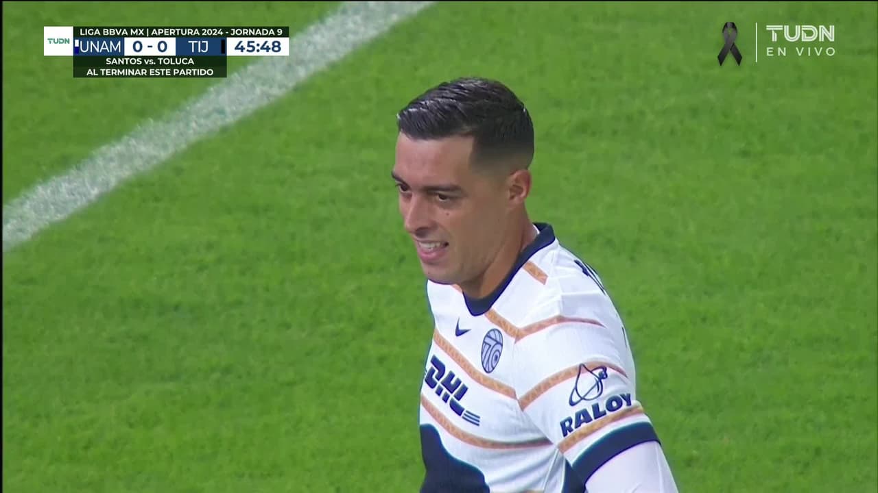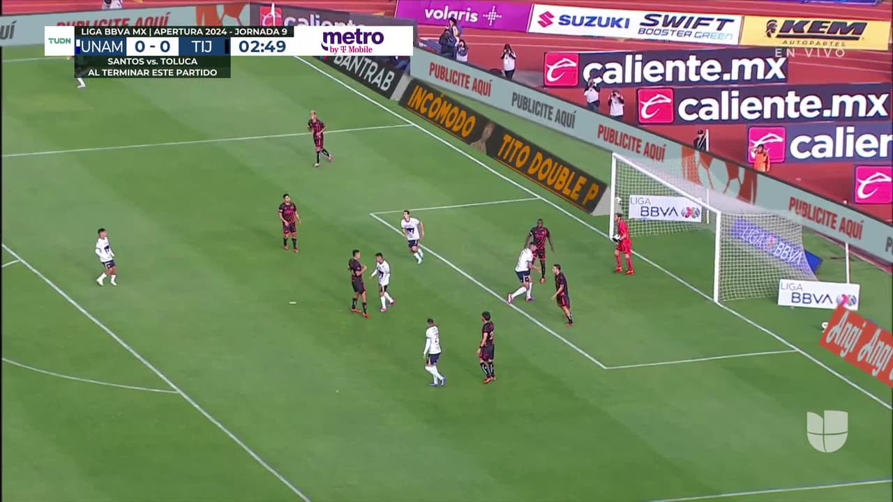 Gran centro de costado que le cayó perfecto al Memote Martínez, quien remató de volea y el portero de Tijuana evitó el tanto de Pumas.