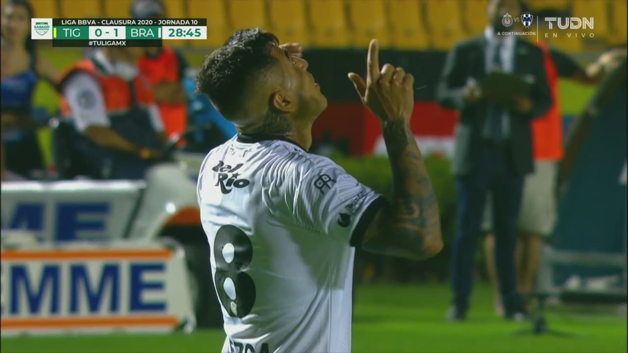Gran pase de Maximiliano Olivera al delantero paraguayo que de pierna derecha fusila a Nahuel Guzmán.