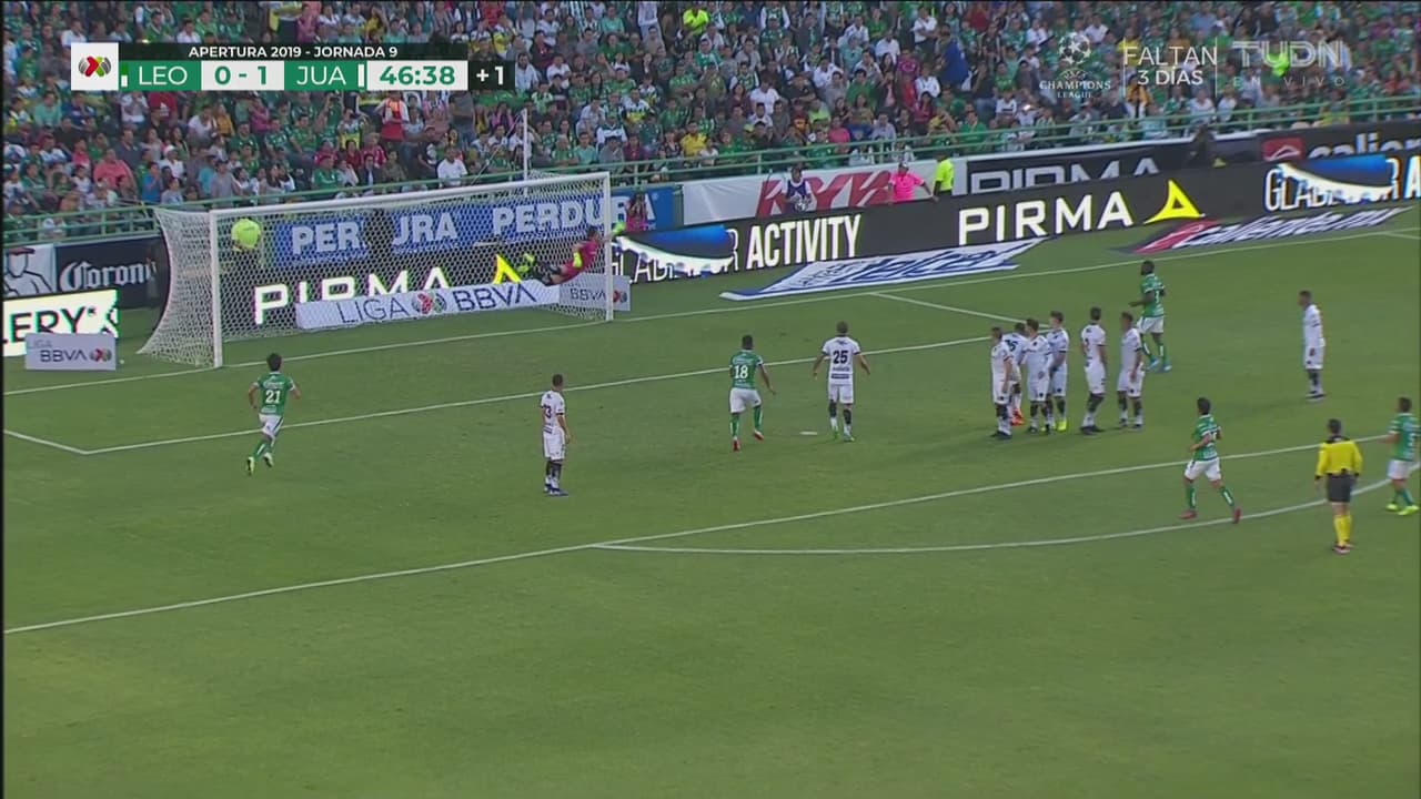 El lateral del León ejecuta por encima de la barrera y el balón pasa muy cerca del poste.