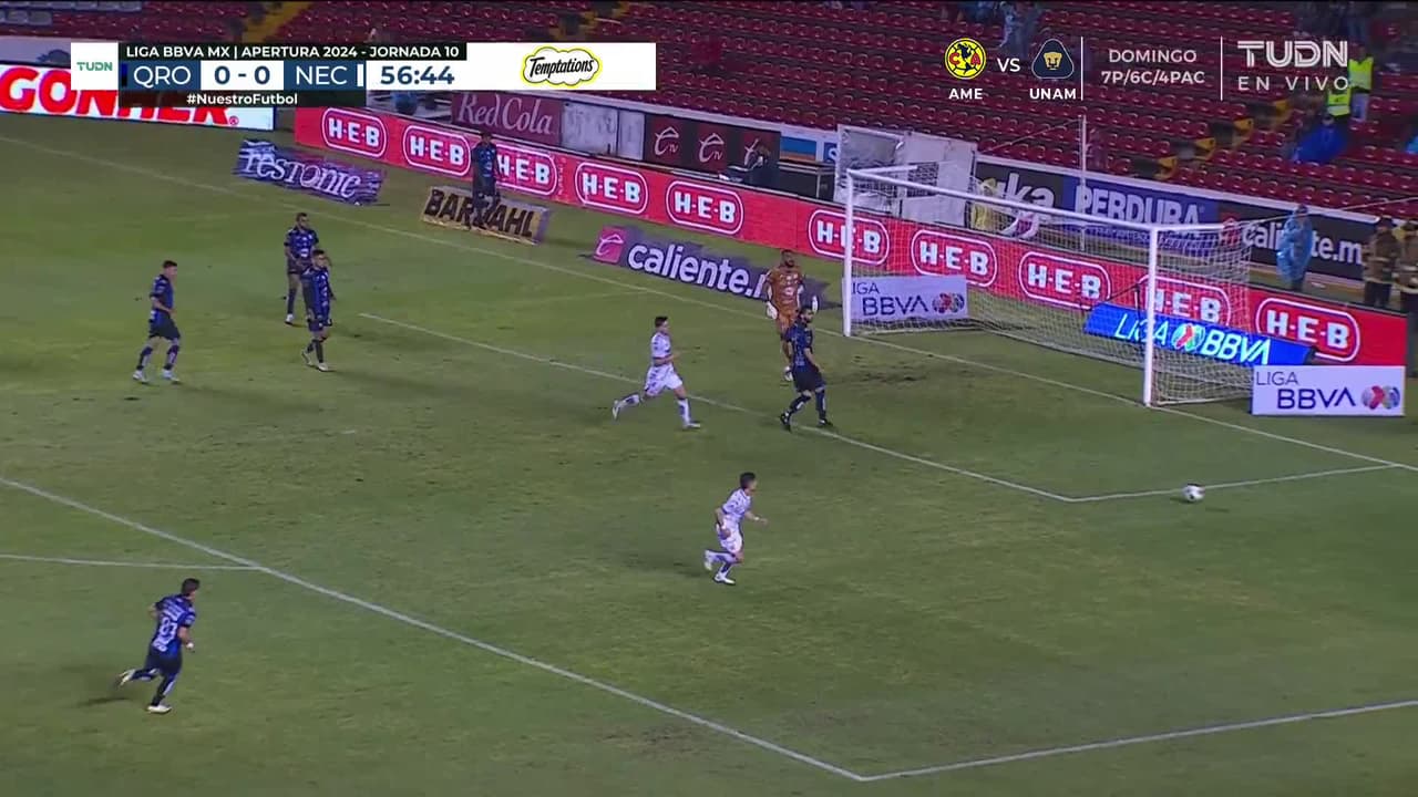El delantero necaxista intenta colocar bien su tiro, pero Alilson vuelve a salvar al Querétaro.