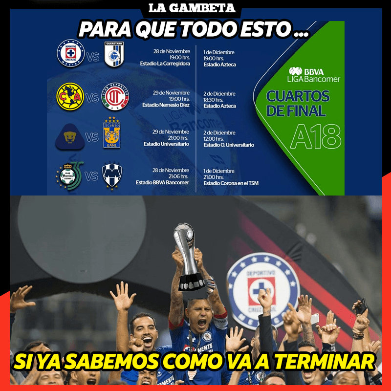 Del otro lado el panorama es claro, Cruz Azul puede perder hasta por dos goles (siempre y cuando Querétaro no anote tres tantos) y estaría en semifinales. El empate o la victoria lo ponen en la siguiente ronda.
