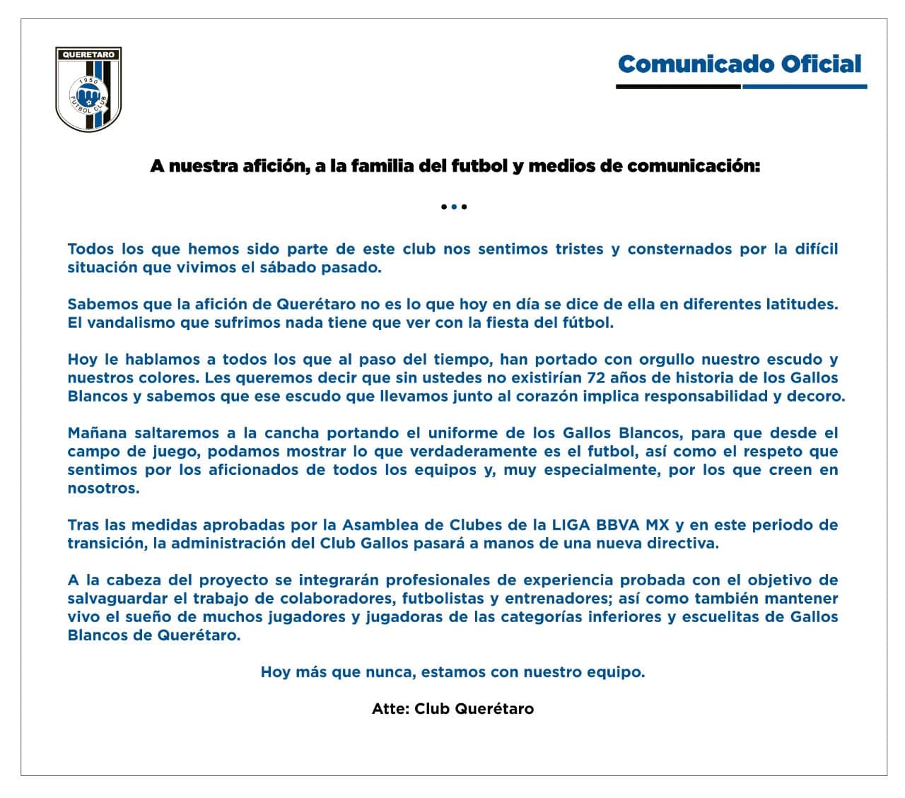 “Tras las medidas aprobadas por la Asamblea de Clubes de la Liga MX y en este periodo de transición, la administración del Club Gallos pasará a manos de una nueva directiva.