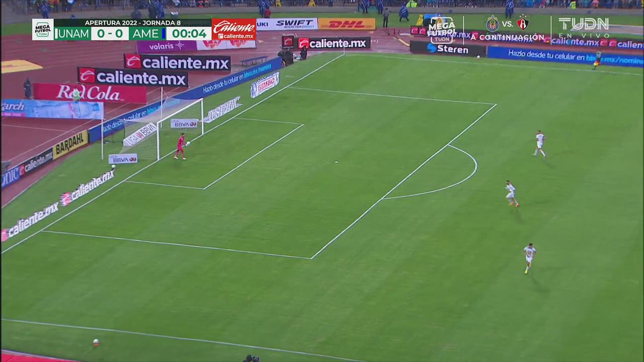Arranca el Clásico Capitalino y el mediocampista del América ve adelantado al portero, al 1'.