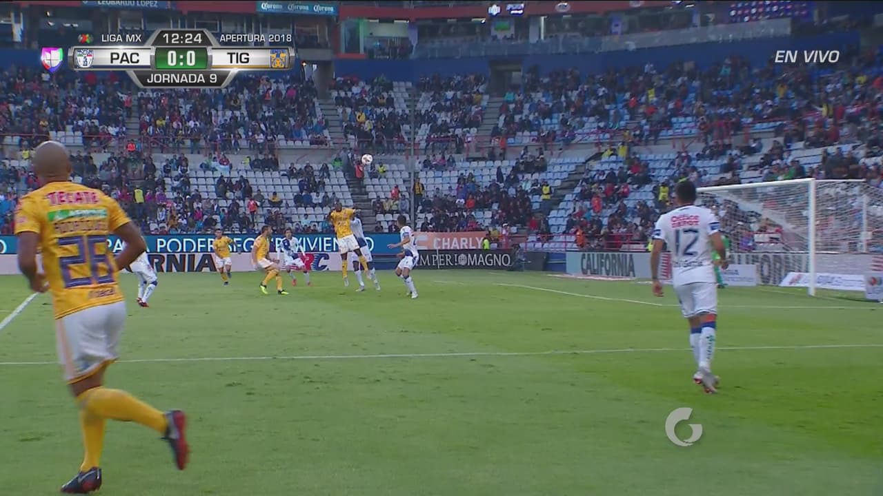 Con centro de Guido Pizarro y remate de cabeza de Julián Quiñones, los felinos ponen peligro en el área rival, pero el esférico queda fuera del segundo paro de Alfonso Blanco.