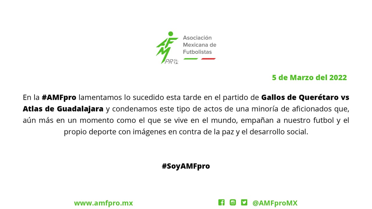 “En la #AMFPro lamentamos lo sucedido esta tarde en el partido de Gallos de Querétaro vs Atlas de Guadalajara y condenamos este tipo de actos de una minoría de aficionados que, aún más en un momento como en el que se vive en el mundo, empañan a nuestro futbol y el propio deporte con imágenes en contra de la paz y el desarrollo social”, tuiteó el organismo.