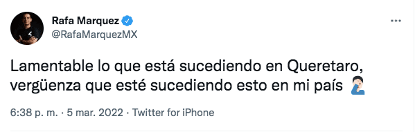 “Lamentable lo que está sucediendo en Querétaro, vergüenza que esté sucediendo esto en mi país”, tuiteó Rafa Márquez este sábado luego de que la cancha del estadio de los Gallos se viera invadida por la afición que corría lejos de la violencia que se generó en las gradas.