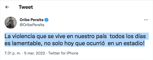 Oribe Peralta fue otro que levantaron la voz a través de las redes sociales en contra de la violencia en el futbol mexicano: "'La violencia que se vive en nuestro país todos los días es lamentable, no solo hoy que ocurrió en un estadio!"