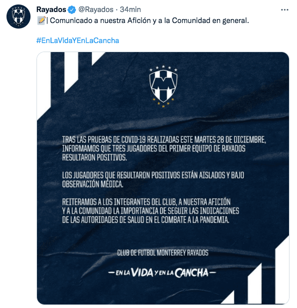“Tras las pruebas de COVID-19 realizadas este martes 28 de diciembre, informamos que tres jugadores del primer equipo de Rayados resultaron positivos. Los jugadores están aislados y bajo observación médica.