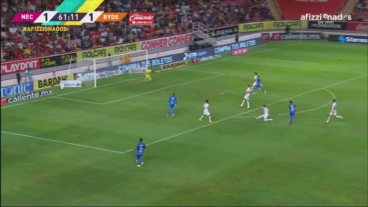 Necaxa pierde el balón en la salida y González conduce para sacar riflazo que ataja el portero al 62’.