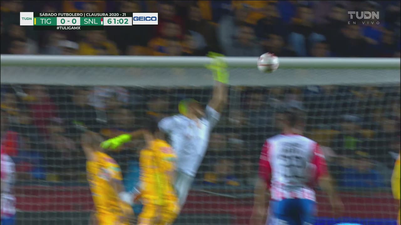 Cabezazo del delantero del San Luis al travesaño y después el arquero de Tigres desvió al 60’.