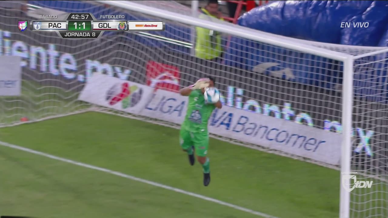 Chivas quiere poner la voltereta y está sobre el área rival para lograrlo, pero el arquero de Pachuca rechaza todo lo que llega.