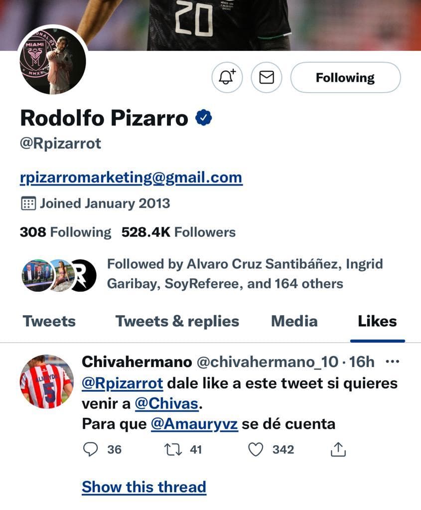 Rodolfo Pizarro, extremo del Inter Miami de la MLS, dio un like solicitado en Twitter y en el cual estaban arrobados tanto el jugador como Amaury Vergara, dueño de Chivas, para que éste viera la intención del jugador por volver a vestir la playera rojiblanca.
